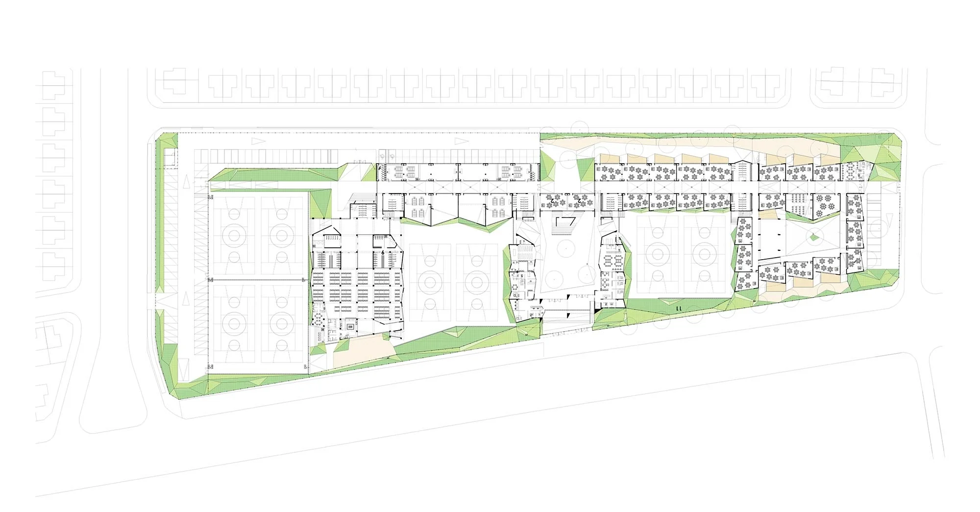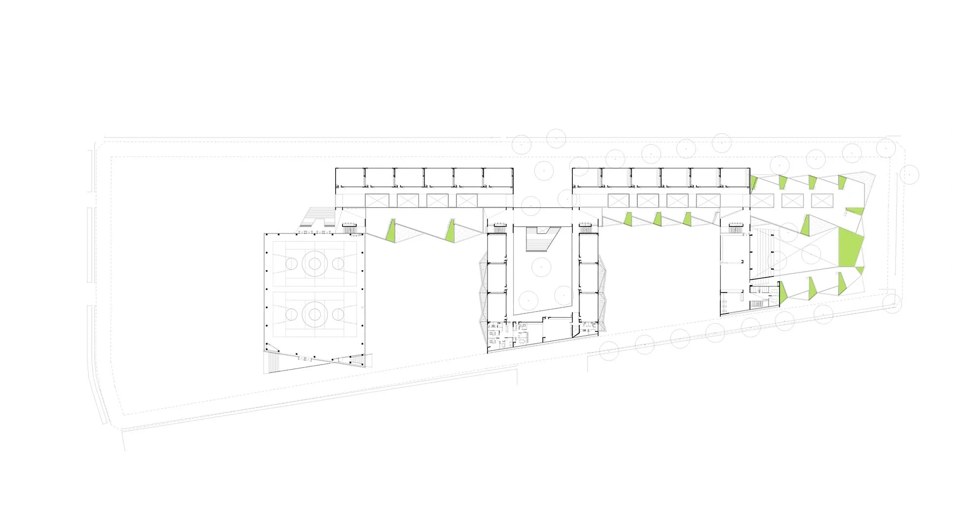El programa se desarrolló en cuatro pisos, distribuidos a lo largo de un recorrido zigzagueante que bordea una secuencia de patios abiertos alternadamente hacia el norte y hacia el sur. Este orden permite mostrar con gran transparencia y apertura la dinámica interna del edificio, de la misma manera que se hizo en el anterior Colegio Terraustral Del Sol.