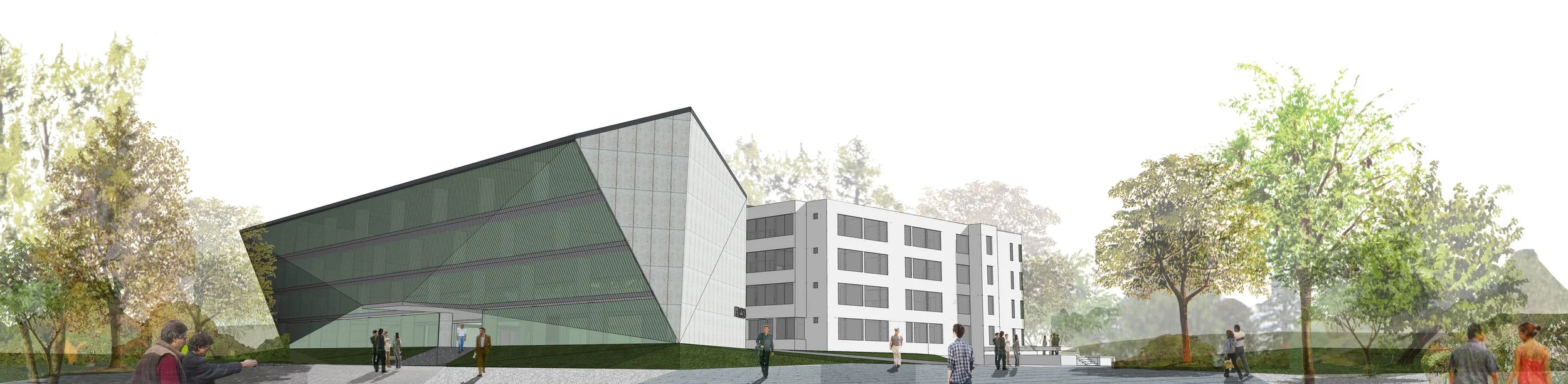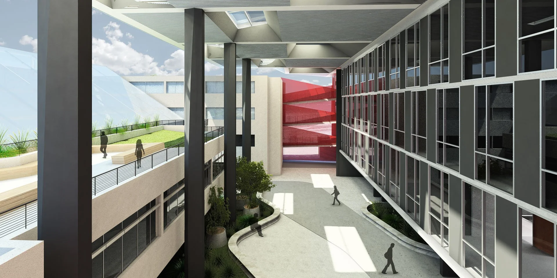 El edificio tiene una geometría longitudinal que propone una imagen unitaria y contundente reinterpretando de manera contemporánea las claves compositivas del edificio existente cuyas referencias formales son abordadas por medio de; volúmenes en voladizo ascendente sobre la fachada, jerarquización formal de zonas de circulación vertical y un vacío entre ambos edificios generando una calle cubierta, el cual tiene el propósito de motivar al encuentro y comunicación interdisciplinar.