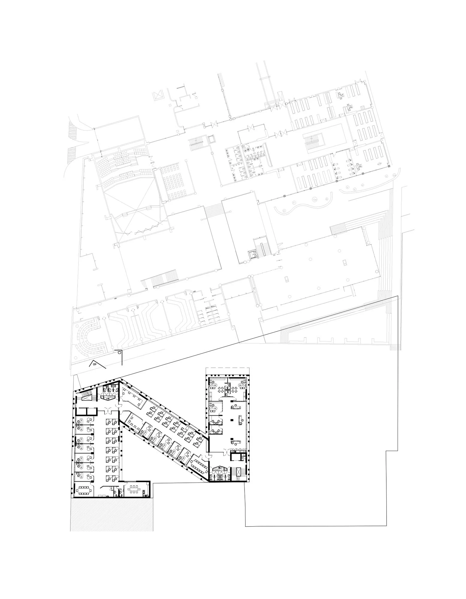 Dentro del terreno comprimido se proyecta un edificio con forma de “Z”, que busca el mayor perímetro de exposición para lograr el máximo de iluminación y ventilación natural para las oficinas proyectadas. La planta acoge situaciones que permitan distintas configuraciones espaciales en el tiempo, donde la forma arquitectónica perdure frente a la organización programática.