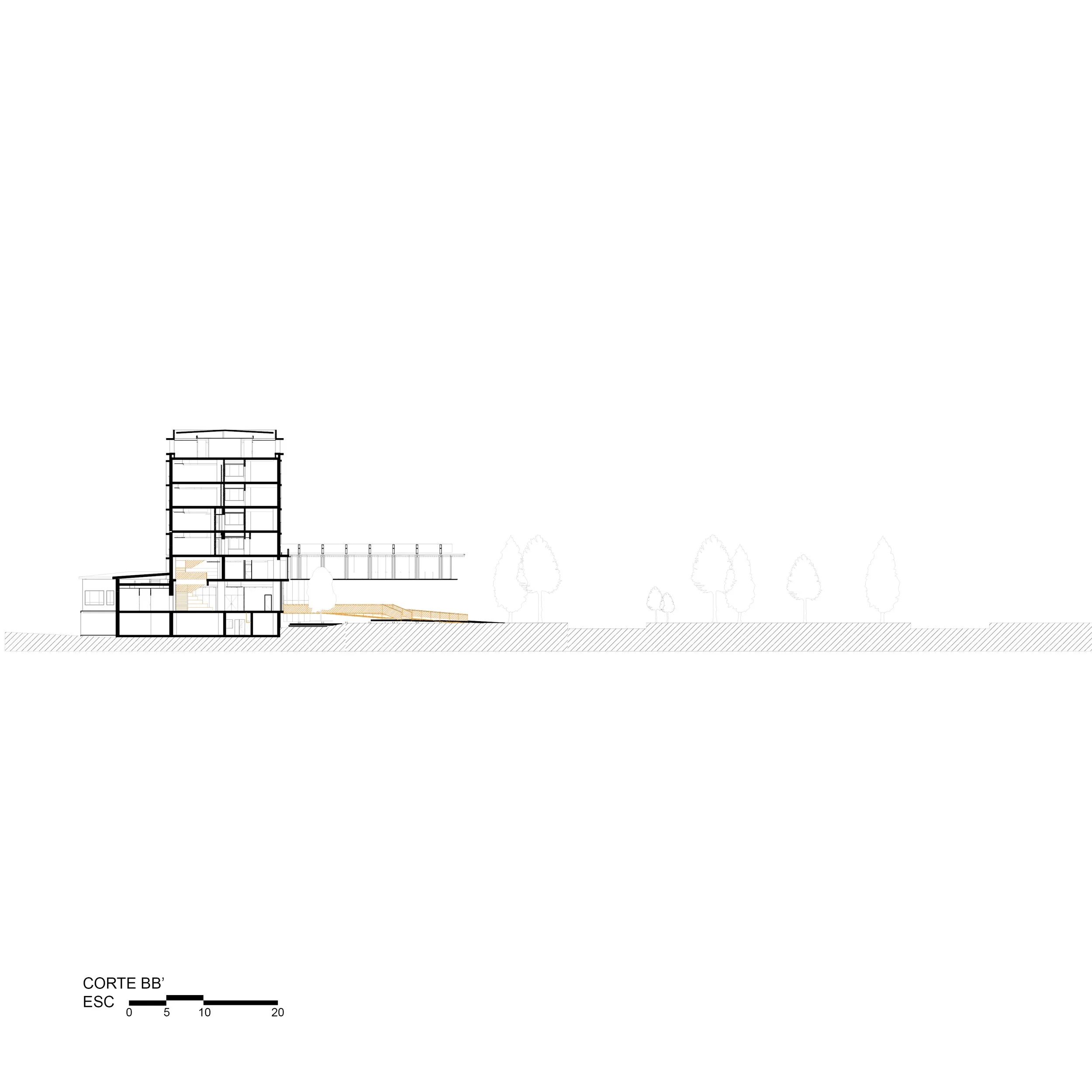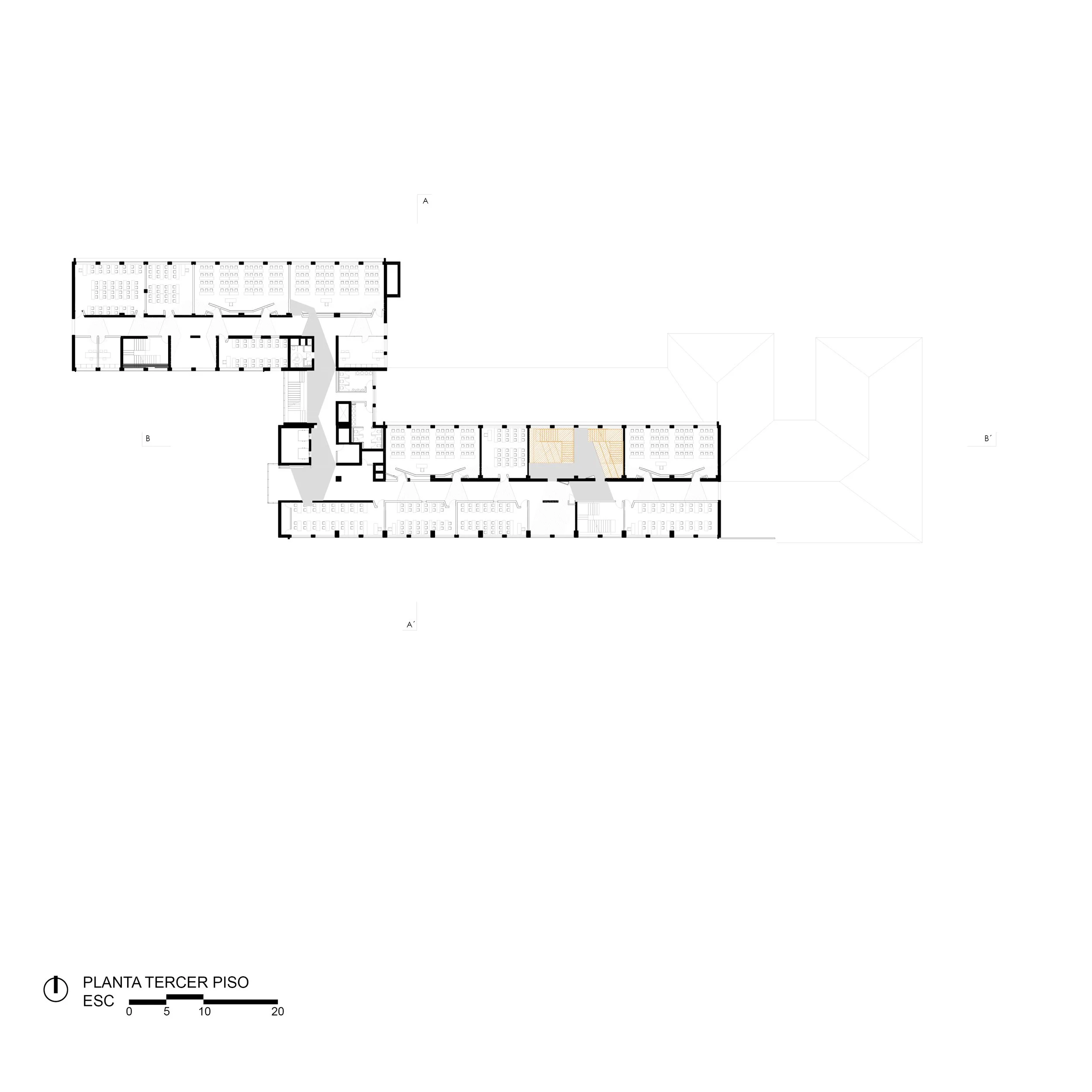 Se estudió la distribución del programa arquitectónico según el flujo de usuarios. Es así como los recintos con mayor carga de uso se ubicaron en el primer piso, entorno al hall de extensión cultural, y en el segundo piso que se habilita como Biblioteca Central, ubicando las aulas de clases, salas de estudio y oficinas en los pisos superiores y concentrando los laboratorios, que requieren mayor relación con áreas de carga y descarga, en el piso zócalo del edificio.