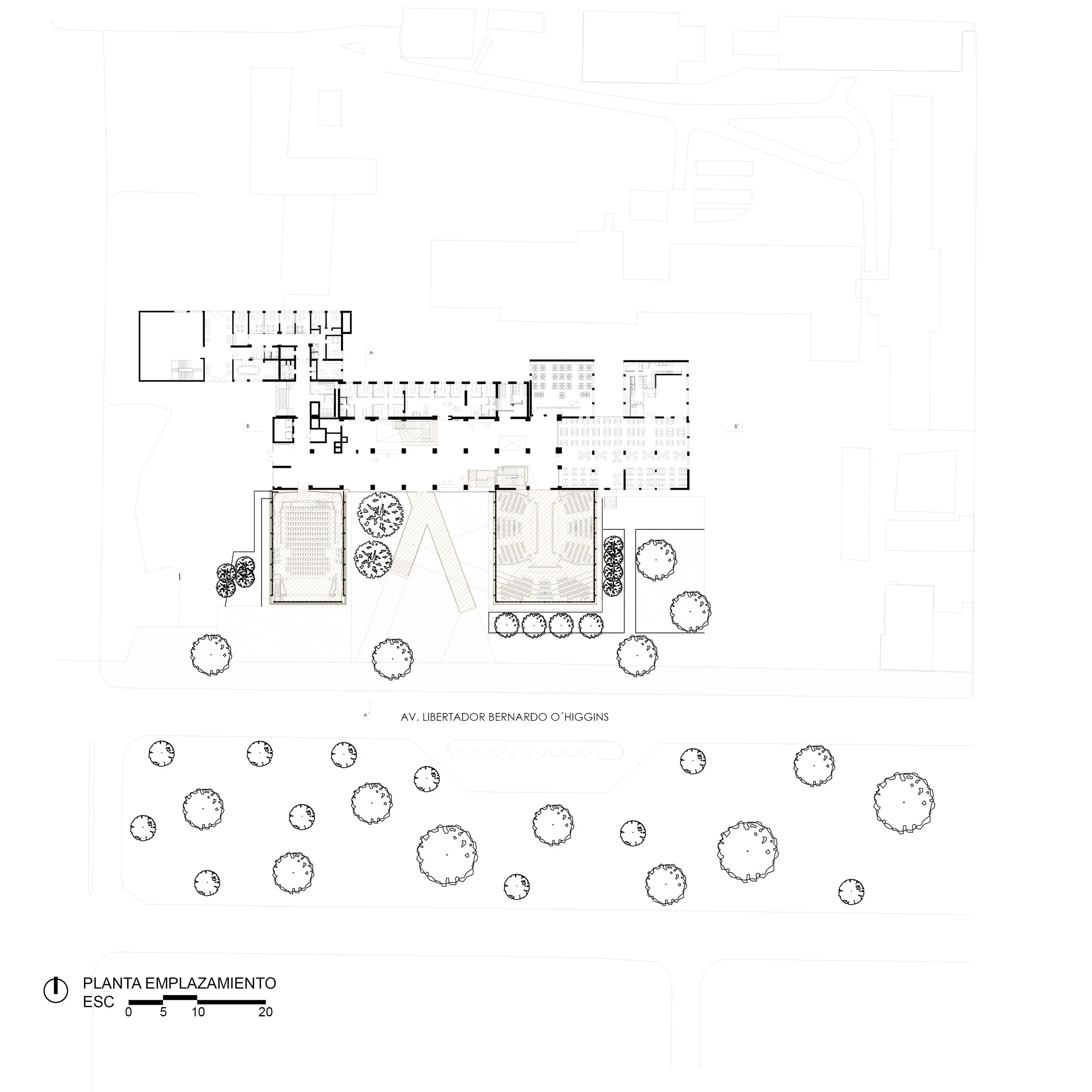 Se demuelen los muros y rejas perimetrales, generando una gran plaza pública de acceso que proyecte la imagen de la nueva Universidad sobre la Alameda, transformando el antiguo patio sur enrejado en un atrio cubierto de escala urbana, una plaza de encuentro y representación cultural que abra sus puertas a la ciudad y a través de la cual todos los usuarios accedan al Hall de Extensión y, desde éste, a los programas de uso publico que se disponen en el primer piso del edificio (auditorios, aulas y casino), así como a la Biblioteca que se toma todo el segundo piso, abaldonándose al atrio de doble altura.