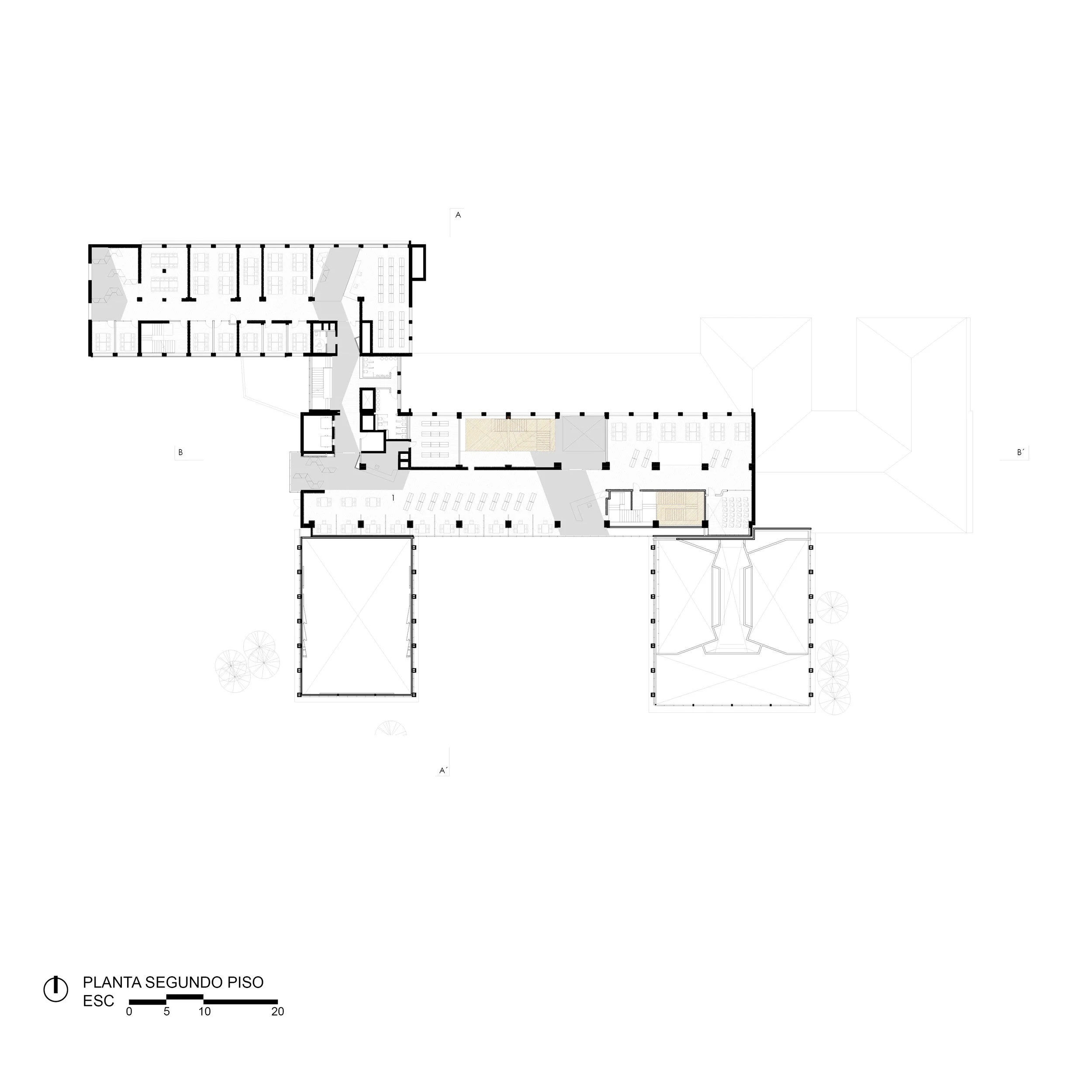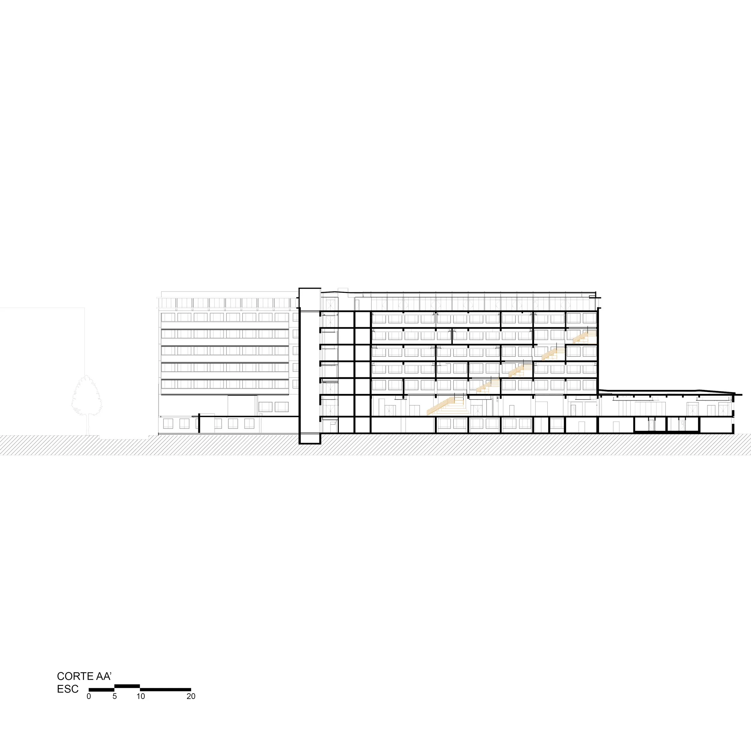 Debido a la buena calidad estructural de la obra gruesa preexistente, su rigurosa modulación de 8x8mts y una altura de 3,6mts entre pisos, las intervenciones no requirieron mayores refuerzos estructurales, siendo ligeras en su mayoría, lo que permitió optimizar el uso de los grandes recintos existentes y generar espacios flexibles, unibles y adaptables en el tiempo.